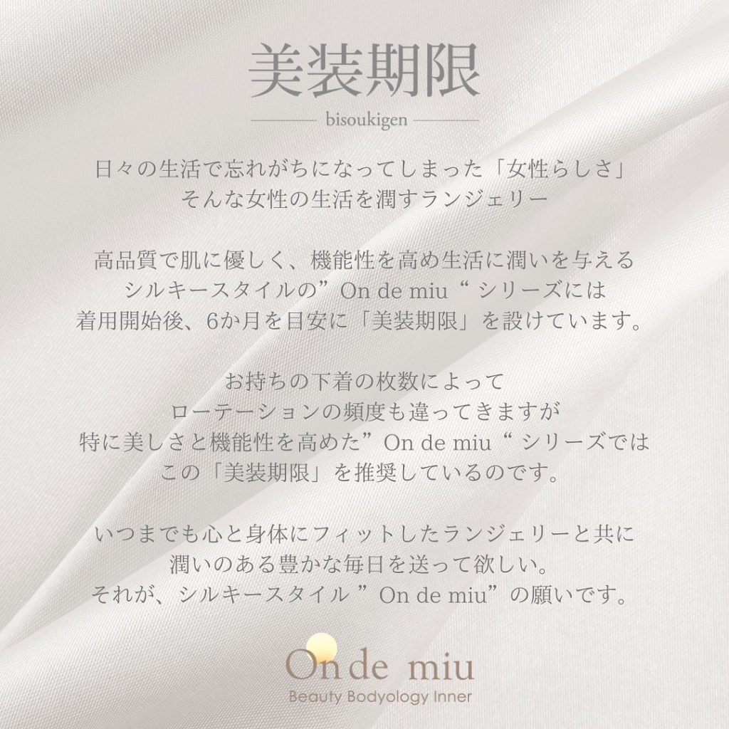 日々の生活で忘れがちになってしまった「女性らしさ」。そんな女性の生活を潤すランジェリー。高品質で肌に優しく、機能性を高め生活に潤いを与えるシルキースタイルの”On de miu“ シリーズには着用開始後、6か月を目安に「美装期限」を設けています。お持ちの下着の枚数によってローテーションの頻度も違ってきますが特に美しさと機能性を高めた”On de miu“ シリーズではこの「美装期限」を推奨しているのです。いつまでも心と身体にフィットしたランジェリーと共に潤いのある豊かな毎日を送って欲しい。それが、シルキースタイル ”On de miu”の願いです。
