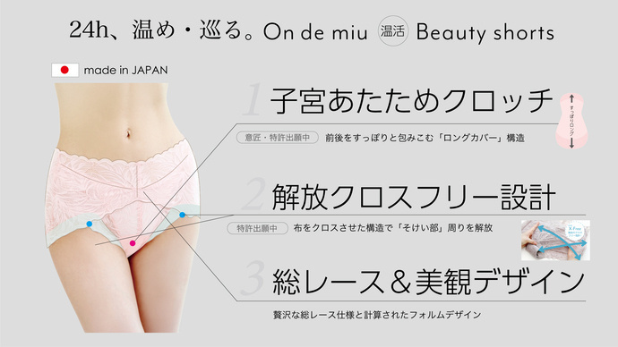 弊社が運営するボディーオロジーサロン”On de”で集められた、「温めと巡り」に関する多くの女性悩みを解決すべく「女性の心と身体を解放し、もっと自由に」という思いからOn de miuビューティショーツは誕生しました。「温めと巡り」の環境を整えながら、下着としての「美しさ」も追求した、大人のための”美温活インナー”です。ずっと着けていたくなるほどの心地良さで「心と身体」を解放し、自由で美しいライフスタイルをサポートします。