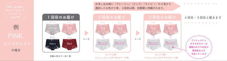ゆらぎ世代の女性の“冷え”と”巡り”に着目した高機能性とデザイン性を兼ね備えた On de miu(オンドミュウ) ビューティーショーツは「インナーから始まる美しいライフスタイルを応援」するために毎月3,000円(税抜)のサブスクリプションにより半年に1回、4枚のショーツをお届けする「”美装期限”定額便コース」をスタート致しました。1回目は定番カラー4色(各一枚)をお届けし、2回目以降は定番カラー4色もしくは、ご選択頂いたカラー1色2枚と下着コンシェルジュセレクトカラー2枚のどちらかを選択して頂けます。4枚のメーカー希望小売価格が合計20,000円(税抜)のところ、サブスクリプションの場合は6か月合計で18,000円(税抜)とメーカー希望小売価格合計から10%オフでお買い求めいただけけます。