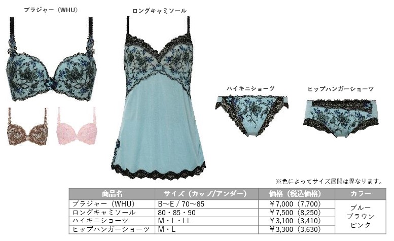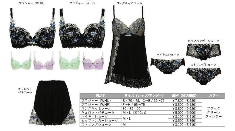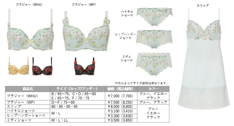 みずみずしいブルー、陽光のようなイエロー、春のまろやかな夜を思わせるブラック。それぞれの魅力的なカラーに、小さな花たちが咲き誇る愛らしいデザイン。刺繍にはさりげなくラメをきかせて、輝きのアクセントを。ブラジャーは、取り外し可能なパッド付きの(WHU)と、豊かなバストをナチュラルに整える(WP)の2タイプをご用意しています。