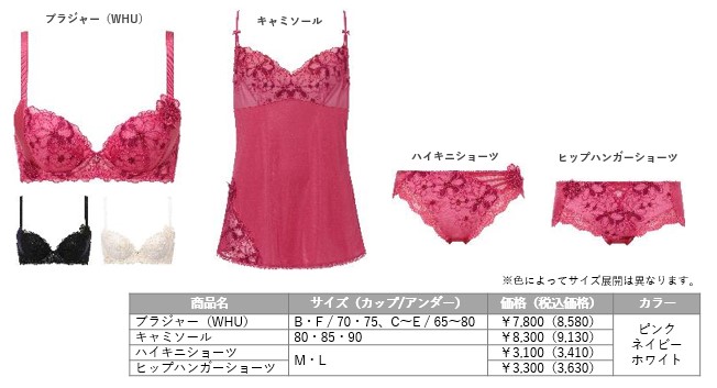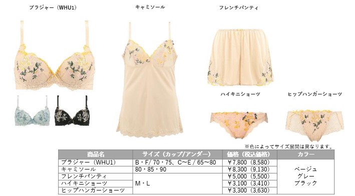 クラシカルなムードをまとい、胸元で象徴的に咲くバラをレースの刺繍で表現したシリーズです。ブラジャー(WHU1)は3Dソフトパッドでバストを下からしっかりプッシュアップするタイプ。カラーは、刺繍のイエローが春らしいベージュ、グレーやピンクの配色がフェミニン&シックなブラック、ワントーンでモダンなグレーの3色です。