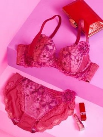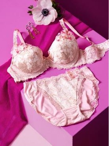 繊細でエアリーな花びらモチーフのレースが浮かび上がる、ノスタルジックなムードのシリーズです。ブルーはコケティッシュ、ブラウンは落ち着いた印象、ピンクはフェミニンと、カラーによって異なるさまざまな表情が魅力です。ブラジャー(WHU)は脇からしっかり寄せ、低めの前中心で魅力的な谷間を演出するタイプです。