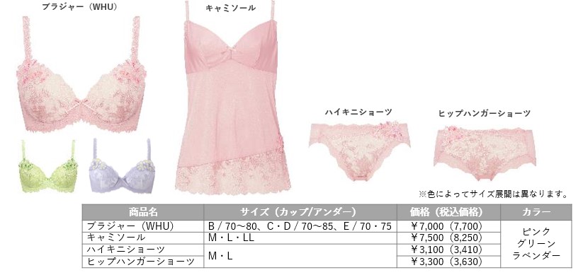今シーズンのテーマの「自然の美しさ」を、さまざまな植物や花々の刺繍で表現しました。ブラジャー(WHU)は、取り外し可能なパッド入りで、バストを自在にボリュームアップ。カラーはブルーのモチーフが華やかに映えるブラック、春らしい爽やかなグリーン、大人のフェミニンを演出するラベンダーをご用意しました。