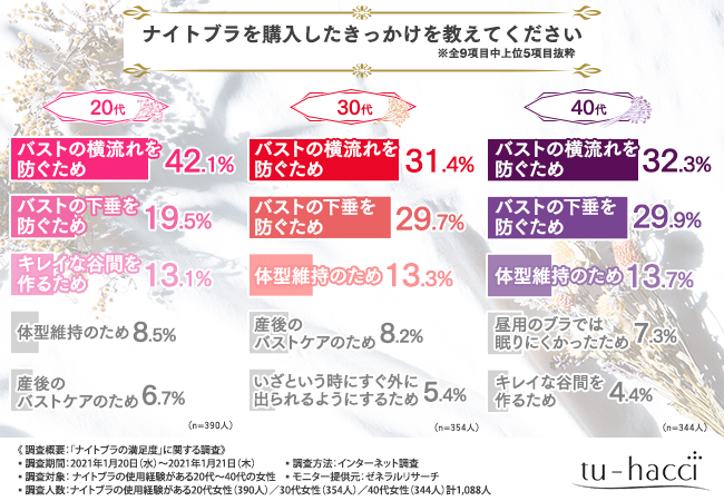 はじめに、ナイトブラを購入したきっかけについて、年代別に詳しく調査してみました。