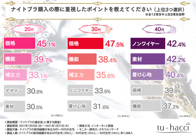 また、20代、30代の女性は価格や機能といったポイントを意識しており、40代の女性はワイヤーの有無や素材といったポイントで購入を決めているようです。