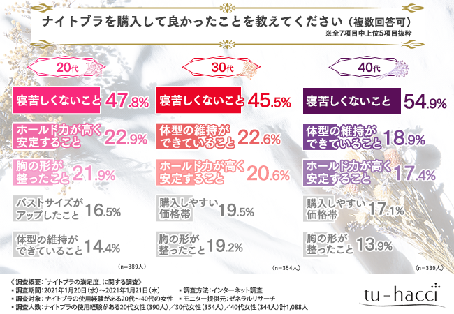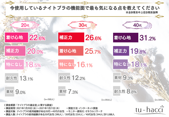 【調査人数】ナイトブラの使用経験がある20代女性(390人)/30代女性(354人)/40代女性(344人)計1,088人