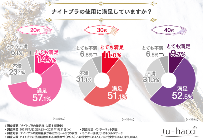 そこで今回、「下着もファッションのパーツ」をテーマに、女性の魅力を最大限に引き出すスタイリッシュ&エレガントな、ランジェリーを提案するブランド『tu-hacci(ツーハッチ)』(https://www.tu-hacci.co.jp/)は、ナイトブラの使用経験がある20代~40代の女性を対象に、「ナイトブラの満足度」に関する調査を実施しました。