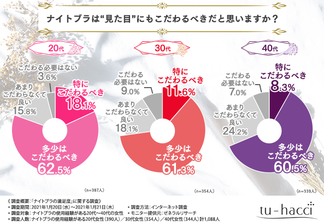 「ナイトブラは“見た目”にもこだわるべきだと思いますか?」と質問したところ、全年代で6割以上の女性が『特にこだわるべき(20代18.1%、30代11.6%、40代8.3%)』『多少はこだわるべき(20代62.5%、30代61.3%、40代60.5%)』と回答しました。