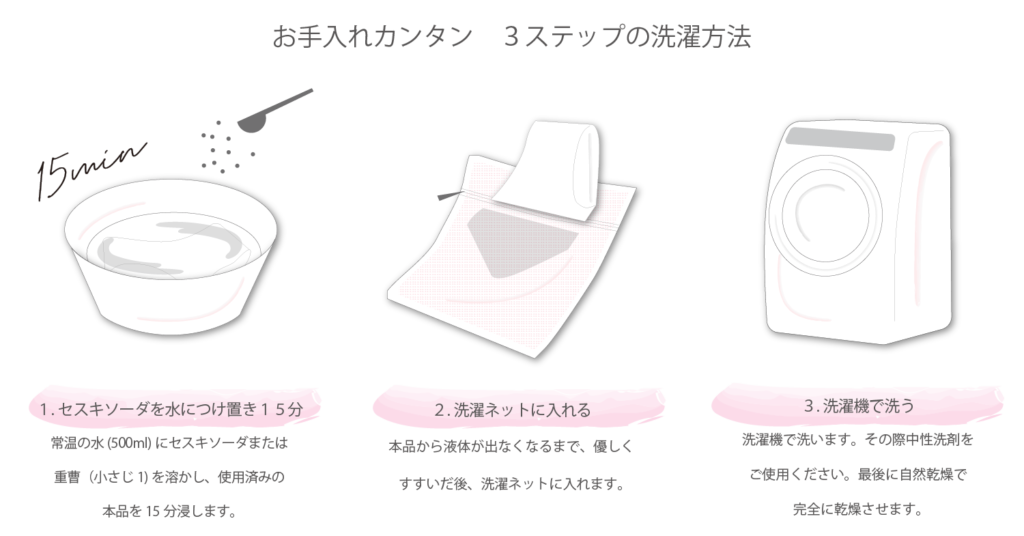セキスソーダを溶かした常温の水の中に浸し、その後洗濯ネットに入れて洗うだけ。
