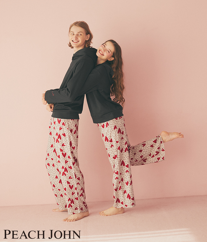 毎年話題のバレンタイン・ペアパジャマ、今年のキーワードは「充電」。一見シンプルなフーディトップは、レディースとメンズそれぞれの袖口にバッテリー&赤いケーブルの刺しゅう入りで、ふたりがくっつくとラブパワーをチャージできる仕掛けです。裏起毛のスウェットであったか素材で寒い冬のおうち時間も快適に過ごせます。